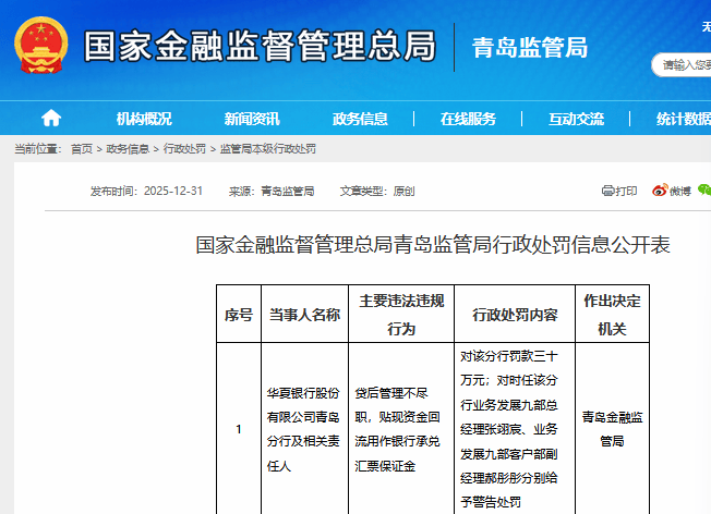2025年最后一天,国家金融监督管理总局青岛监管局发布行政处罚信息公开表,其中,华夏银行青岛分行因贷后管理不尽职,贴现资金回流用作银行承兑汇票保证金,被罚款三十万元。同时,时任该分行业务发展九部总经理张翊宸、业务发展九部客户部副经理郝彤彤被分别给予警告处罚。