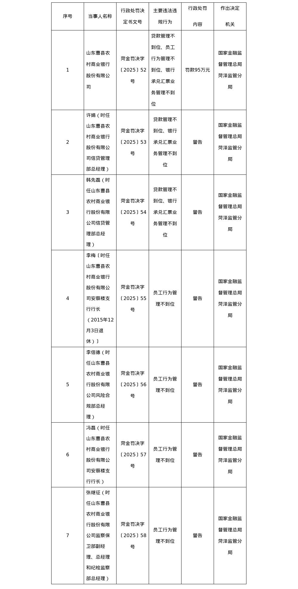 针对以上问题,国家金融监督管理总局菏泽监管分局对其罚款95万元。