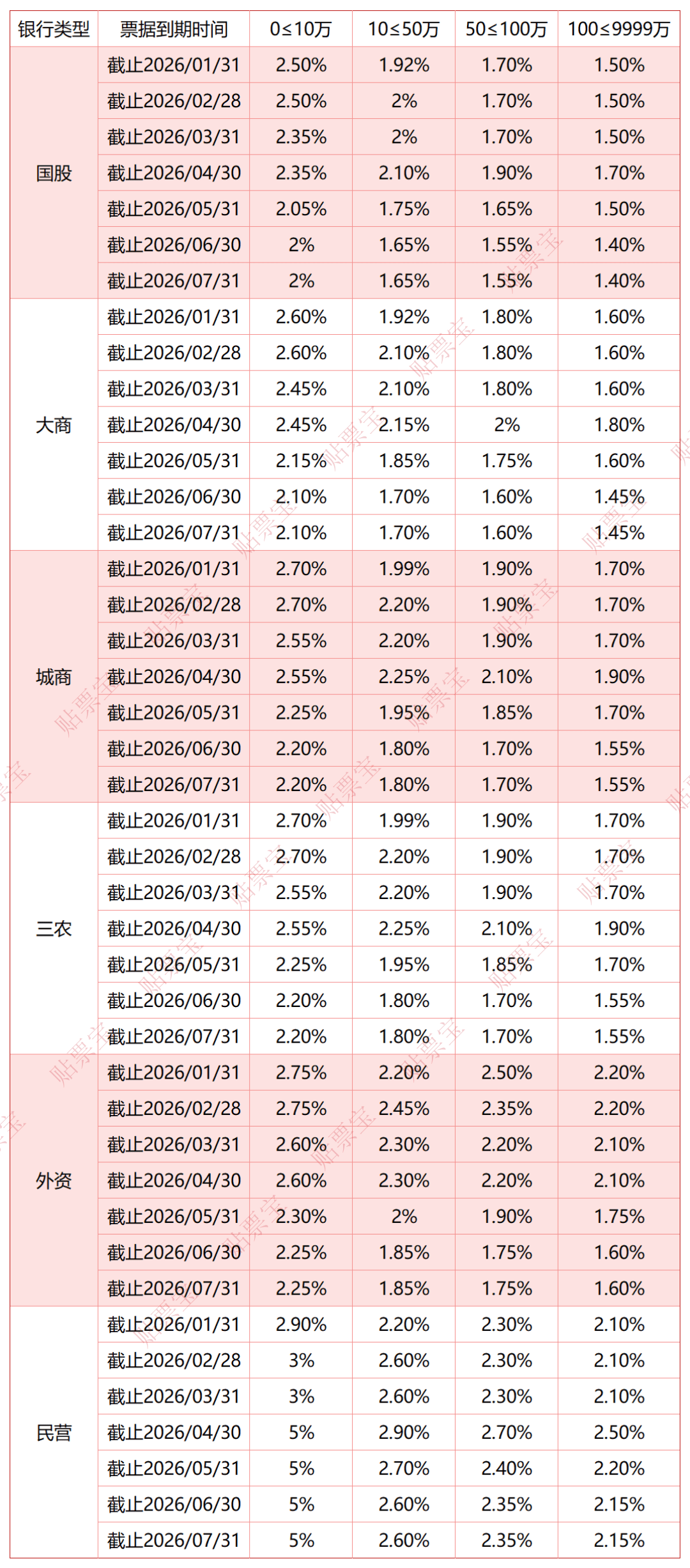 以下为2026年1月7日的银行承兑汇票贴现利率报价表(来源贴票宝):