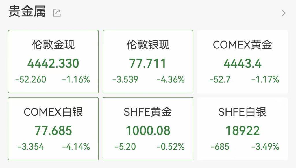 1月7日晚间,白银价格加速下跌,截至发稿时,现货白银(伦敦银现)、COMEX白银均跌逾4%;沪银期货主力合约跌逾3%。
