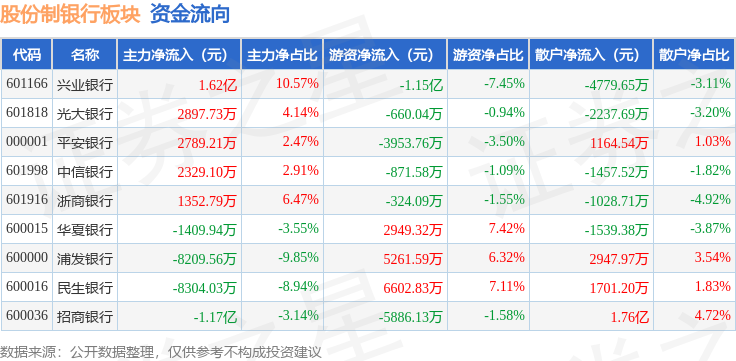 从资金流向上来看,当日股份制银行板块主力资金净流出4057.13万元,游资资金净流出8334.4万元,散户资金净流入1.24亿元。股份制银行板块个股资金流向见下表: