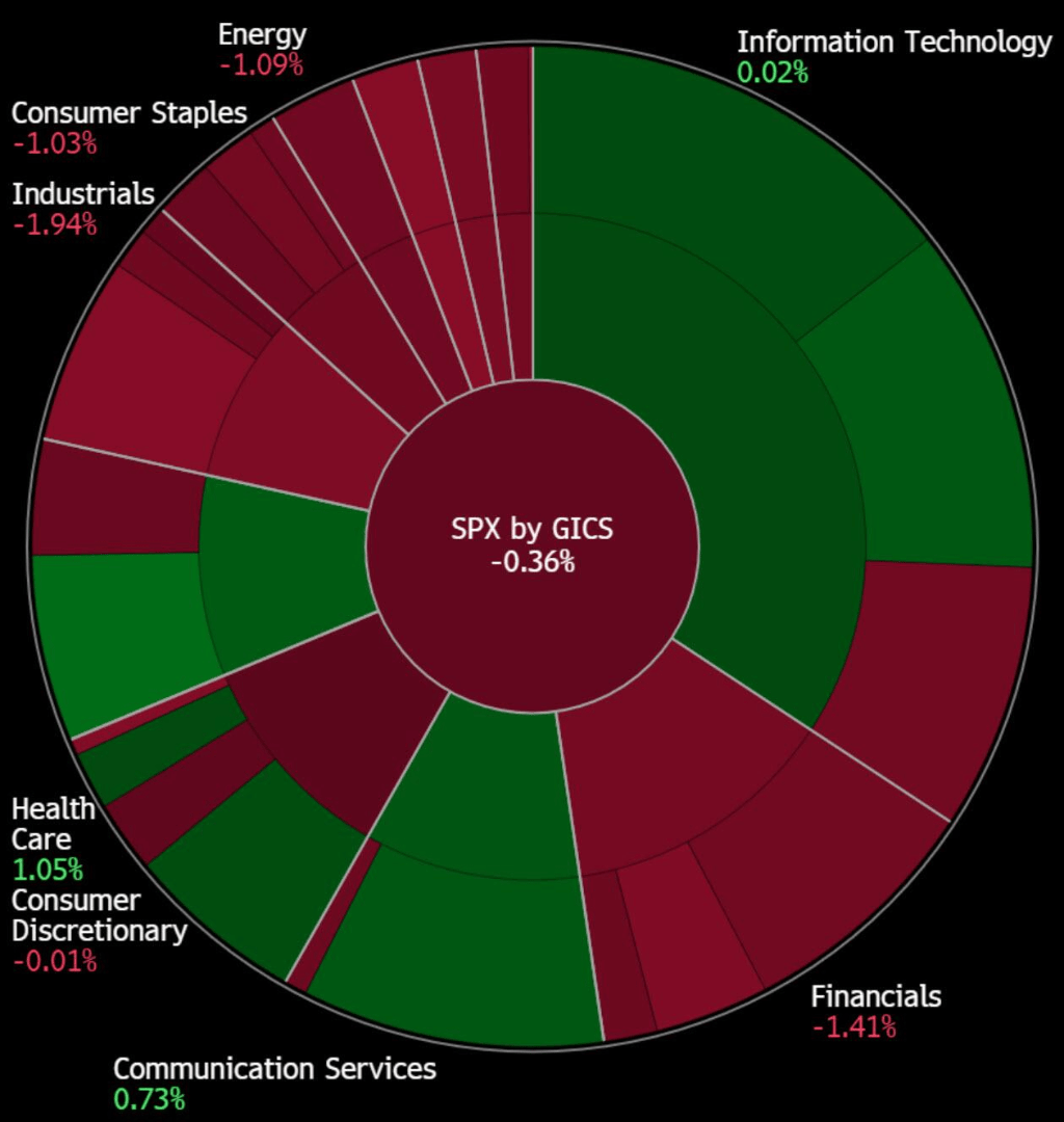 值得注意的是,等权重标普500指数跌幅更大,大多数板块下跌,其中工业和金融板块领跌,而医疗保健和通信板块则保持强劲上涨。
