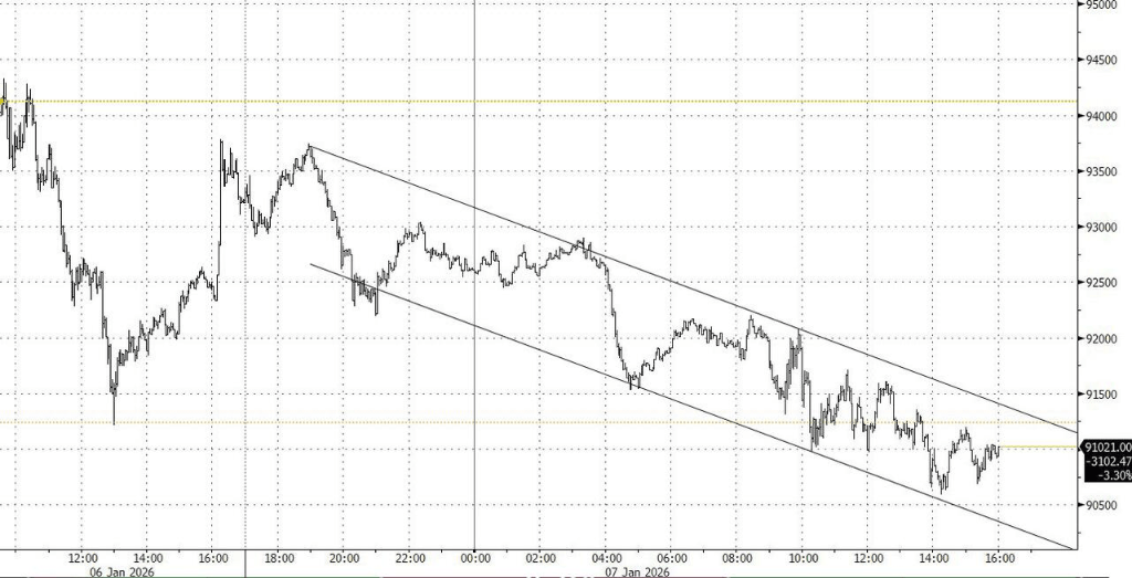 原油价格则继续承压,WTI原油宽幅震荡于57美元下方,市场正在消化美国对委内瑞拉石油行业施加更大控制力所带来的潜在供应增加。加密货币也未能幸免,比特币与以太坊双双下跌,与风险资产的整理步调保持一致。