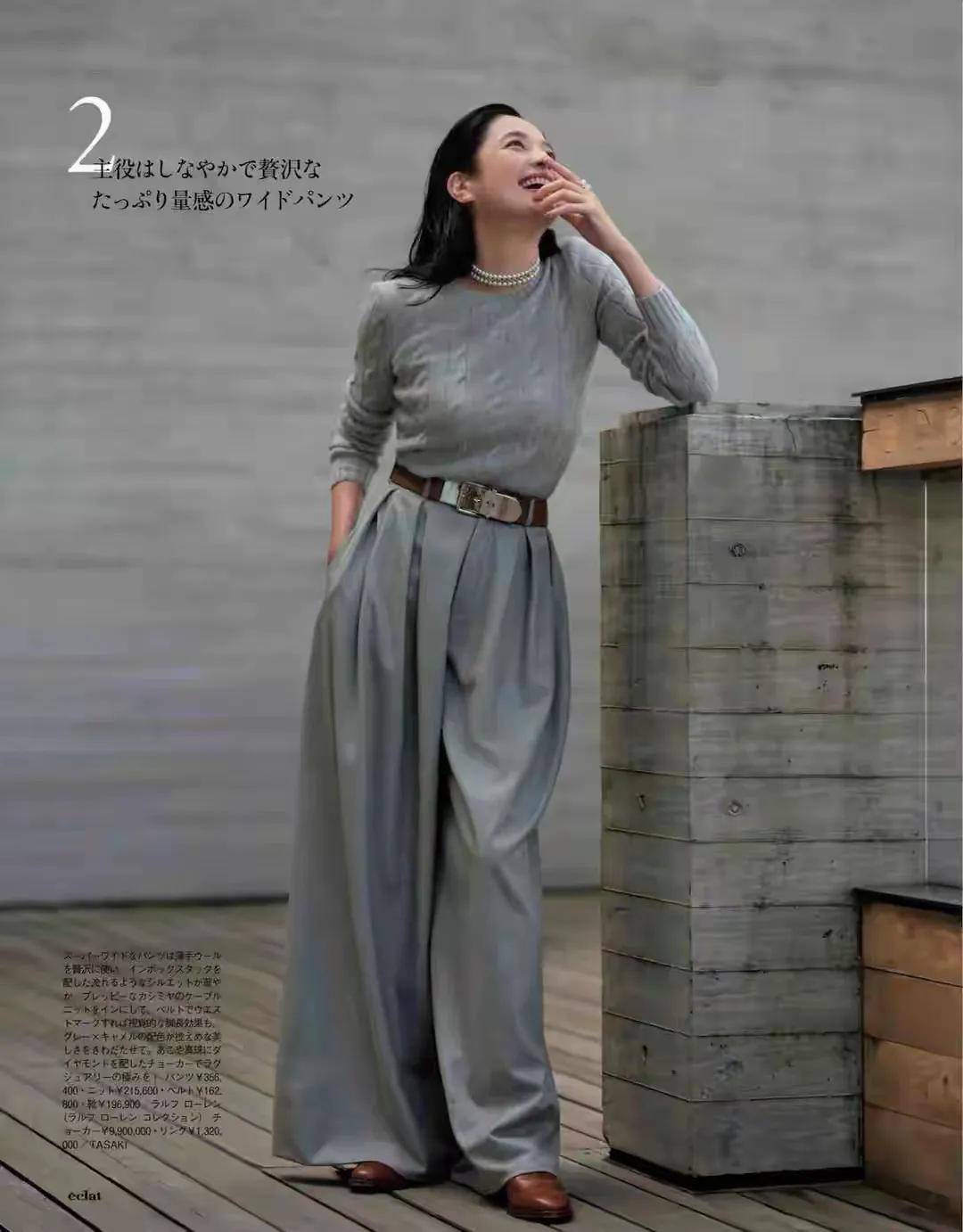 例如,上面这位时尚达人直接选择了灰色的针织毛衣,搭配上灰色的西装阔腿裤,脚上穿着棕色的皮鞋,穿的时候同样也系上了棕色的腰带,形成了高腰线,再加上珍珠项链点缀瞬间整体造型就显得很高级。