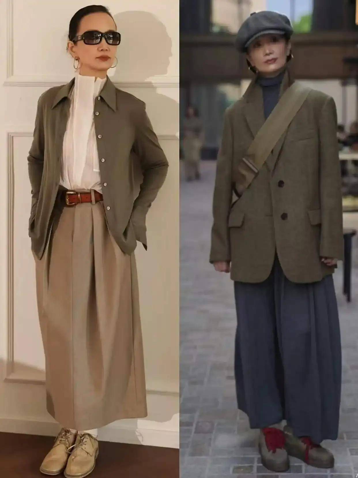 例如,上面这一件西装外套,内搭一件灰色的针织毛衣,加上灰色的阔腿长裤脚,穿那双皮鞋搭配灰色帽子,就能让奔五奔六的中年女性变得很有气质,精神抖擞,同时又很显贵。