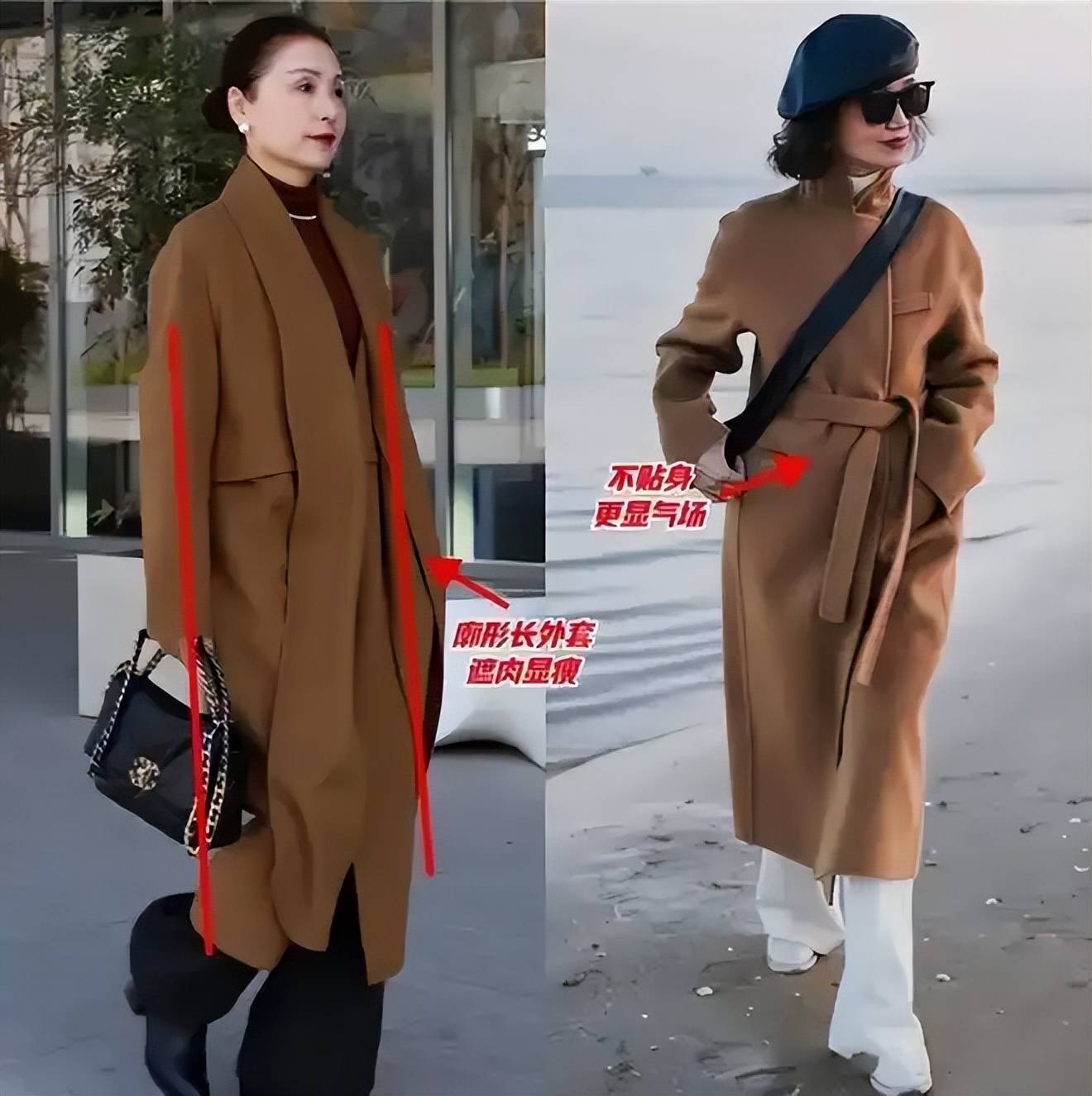 不同的穿搭方式有着不一样的气质,如果你选择的是驼色大衣,而且比较挺括有型,这个时候你可以敞开来穿,完全遮肉显瘦。