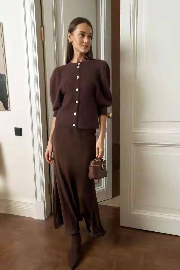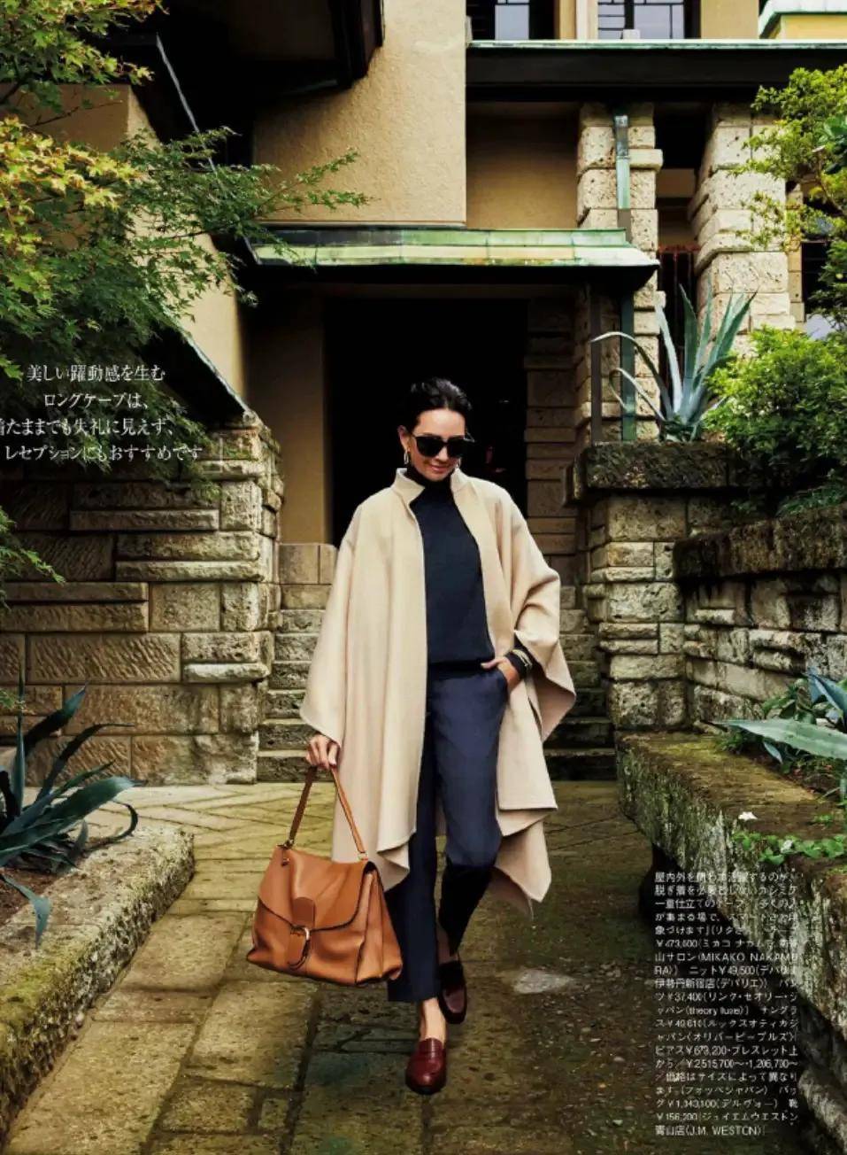 就好比上面这两套,采用了繁简结合的穿搭技巧,用纯色系的棕色外套搭配小印花的直筒九分裤,脚穿一双驼色系的浅口低跟单鞋,再背大地色系的包包,这样的造型优雅干练。