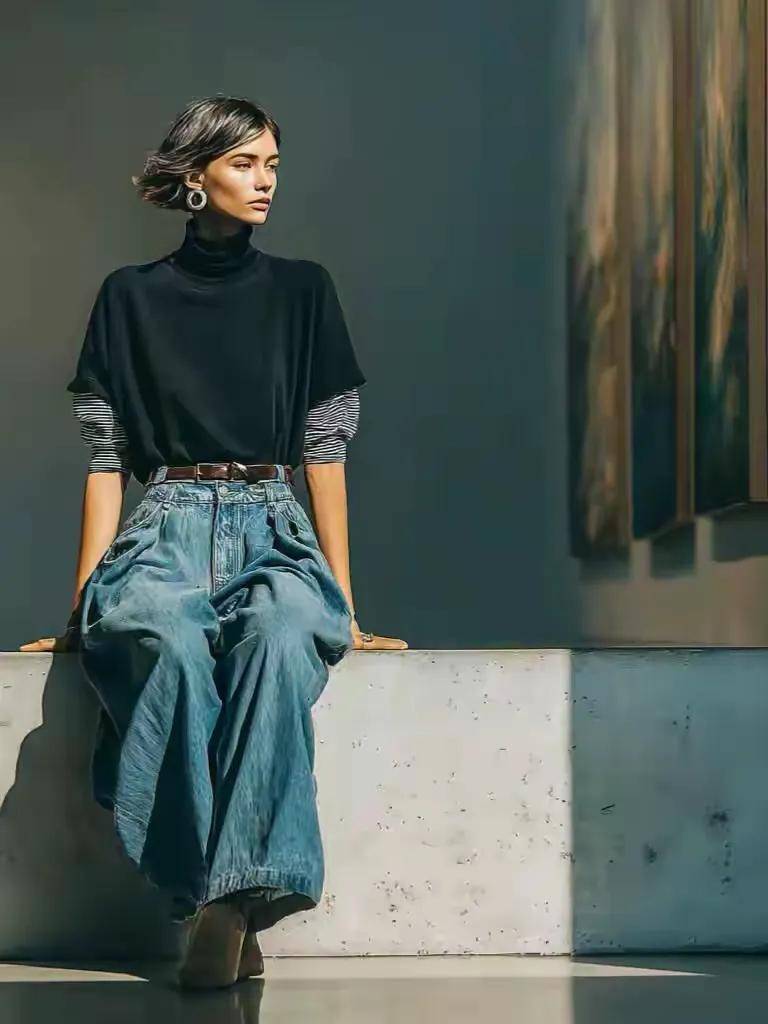 Tips③:黑色毛衣搭配蓝色牛仔阔腿