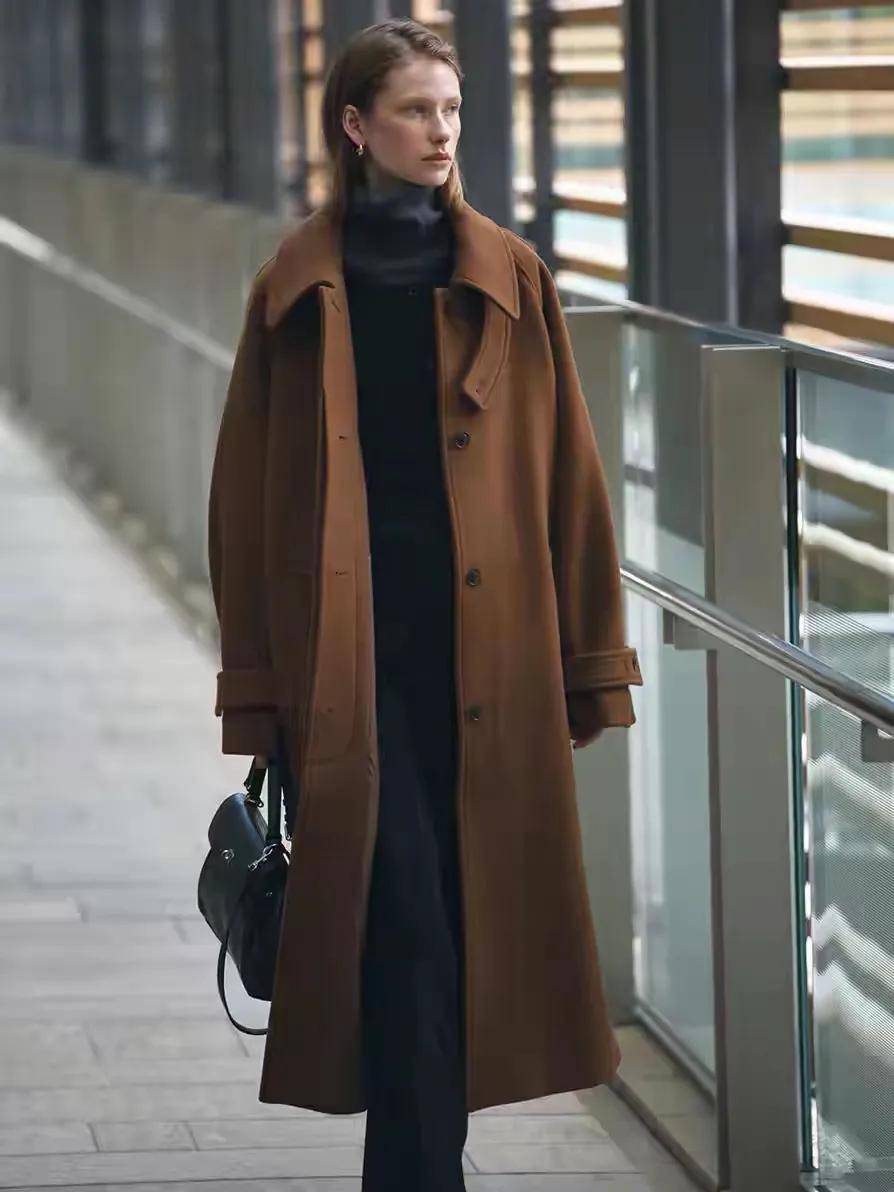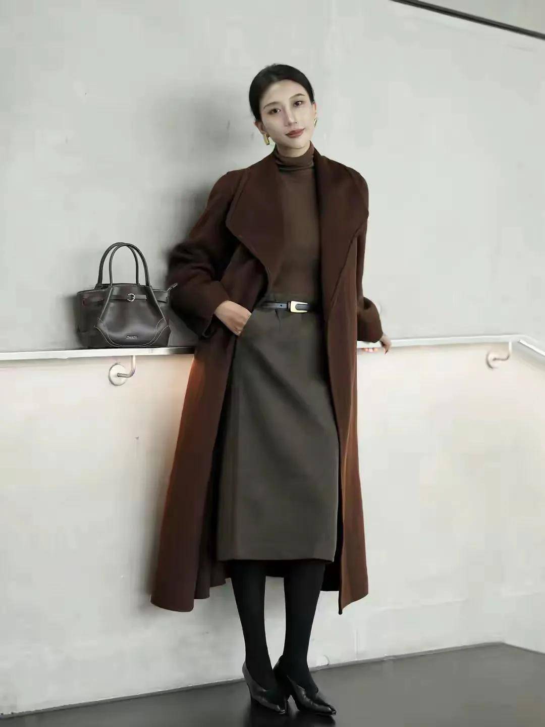 如果你的内搭和下半身的裤装颜色都是属于暗色系,这时候我们可以大面积的采用驼色系的衣服,像上面这一身穿搭就用了驼色的大衣来点缀,瞬间整个人的气质和气场就有了。