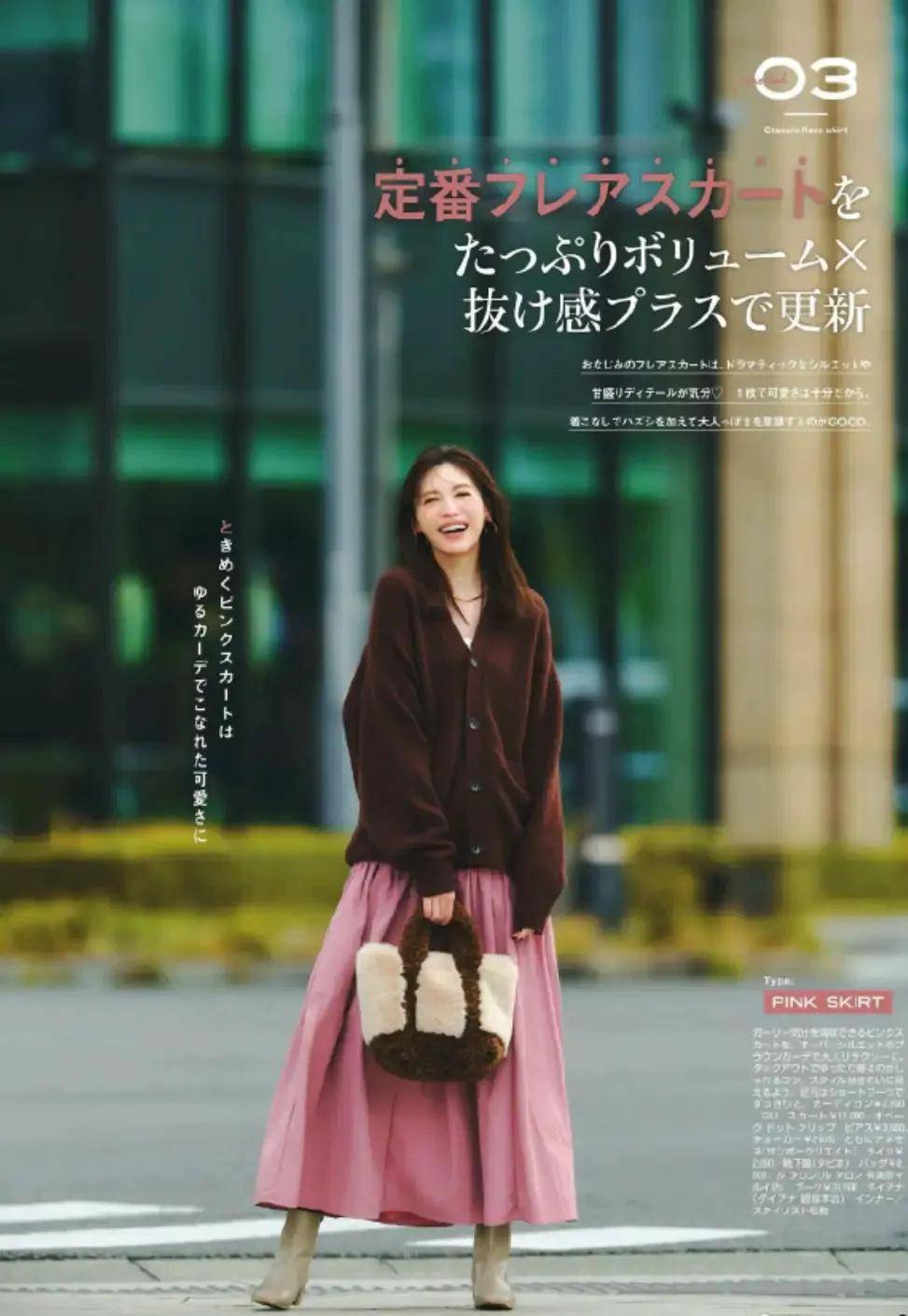 Tips③:驼色针织开衫搭配粉色半身裙