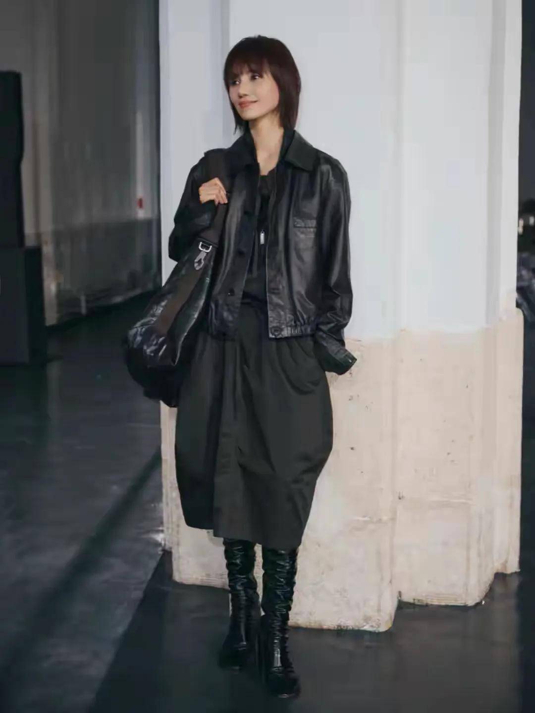 咱们还可以学习袁泉的这一身穿搭,用比较酷的黑色皮衣搭配上一条半身裙,脚穿黑色中筒靴,再挎的一款大包包结合短发造型,整体搭配展现出来视觉效果非常的飒爽,又酷又美。