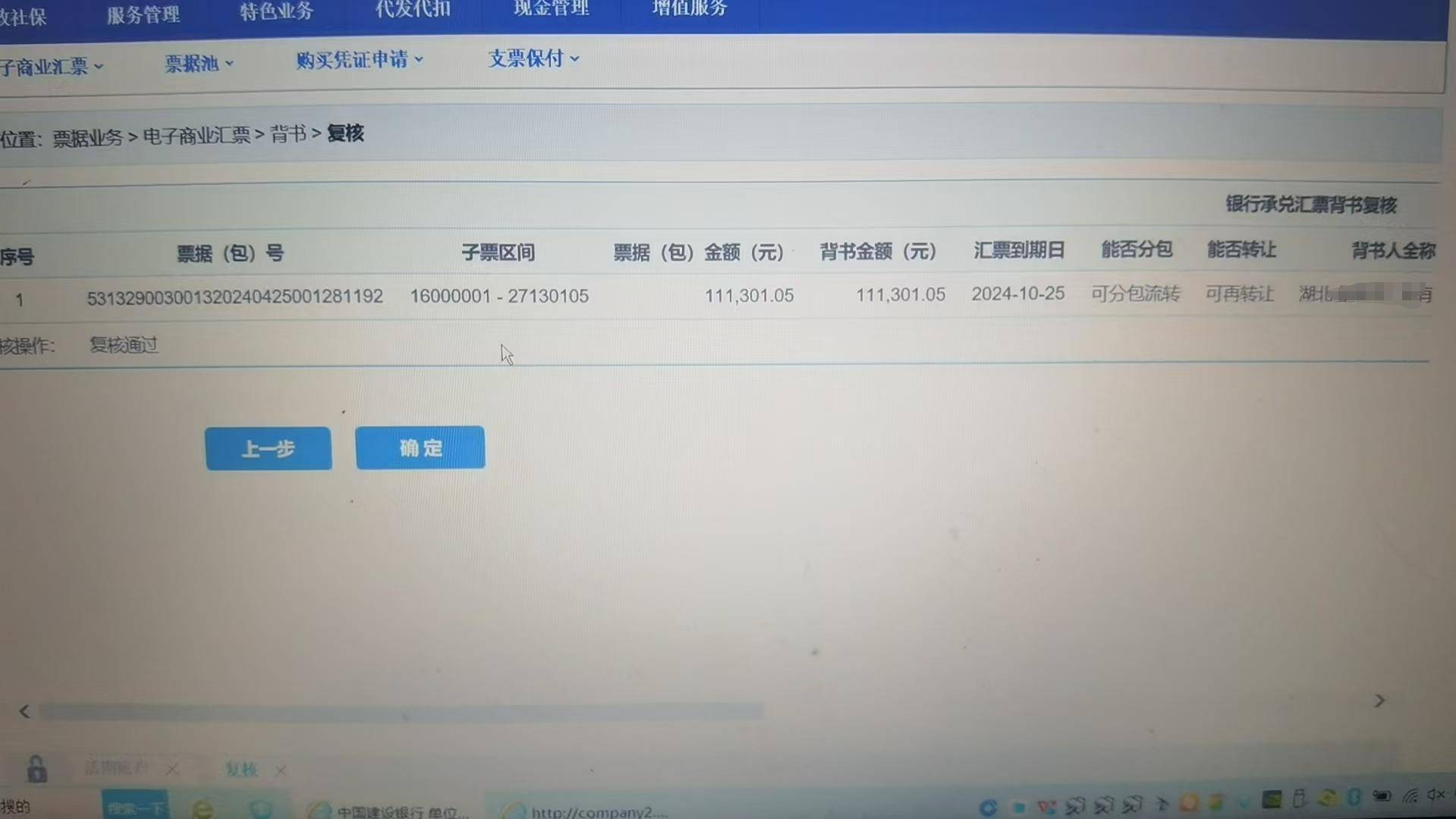 进入“录入背书申请”界面,填写被背书人名称、账号和开户行,这里的金额,可以手动填写票据包金额以内的任意金额,需要背多少就填写多少金额,能否转让选择“可转让”,然后再点“确定”,完成经办操作。