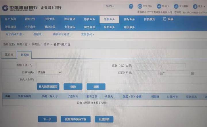 接下来点击 票据业务 - 票据池 - 背书 - 背书转让申请,选择新系统,汇票种类选择可拆分票据,点查询,已持有在户的所有等分化票据,都会在列表中显示出来,选择需要背书转让的可拆分票据,再点 下一步