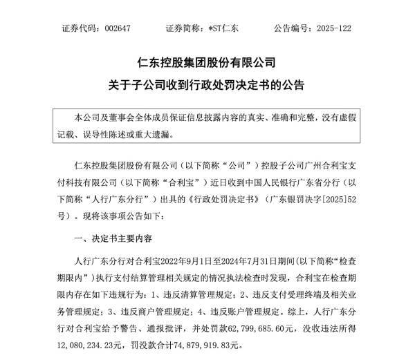 近7500万元的罚没金额,对合利宝支付及其母公司*ST仁东的经营业绩构成直接冲击。