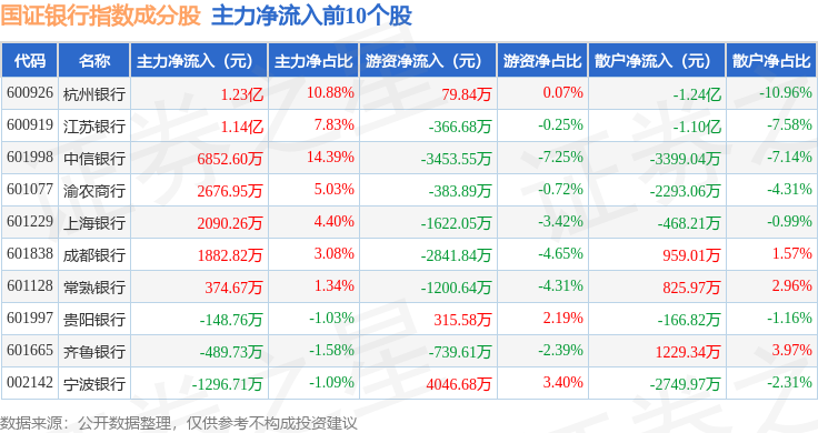 资金流向方面,国证银行(399431)指数成份股当日主力资金净流出合计10.45亿元,游资资金净流入合计6.4亿元,散户资金净流入合计4.05亿元。成份股资金流向详情见下表: