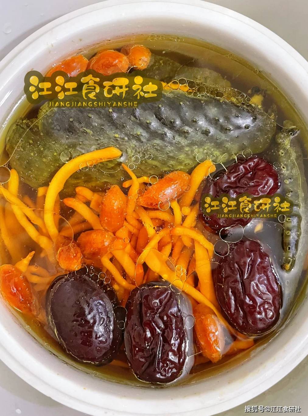 3、此时汤已出味,放入洗净的虫草花一把(约20克)、去核红枣5颗。继续炖20分钟。