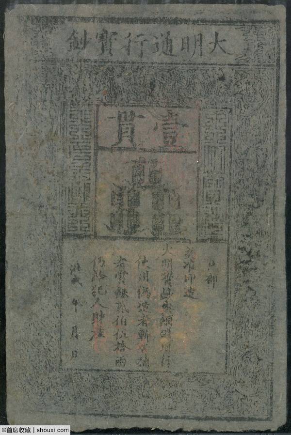 大明通行宝钞壹贯,PMG-50,经典品种,票幅硕大,气息古朴,钱文可辨,6.5万港币落槌,含佣约合人民币7.02万元成交;咸丰五年大清宝钞伍百文易字,PMG-63,带原厂钉孔,有虫蛀,色调明丽,8500港币落槌;咸丰七年大清宝钞壹千文抗字,带原厂钉孔,左上方有损,纸张柔韧,4200港币落槌;光绪30年中国通商银行拾元单面背面试印票,PMG-55,冠军分数,纸质柔韧,钤印清晰,2.2万港币落槌。
