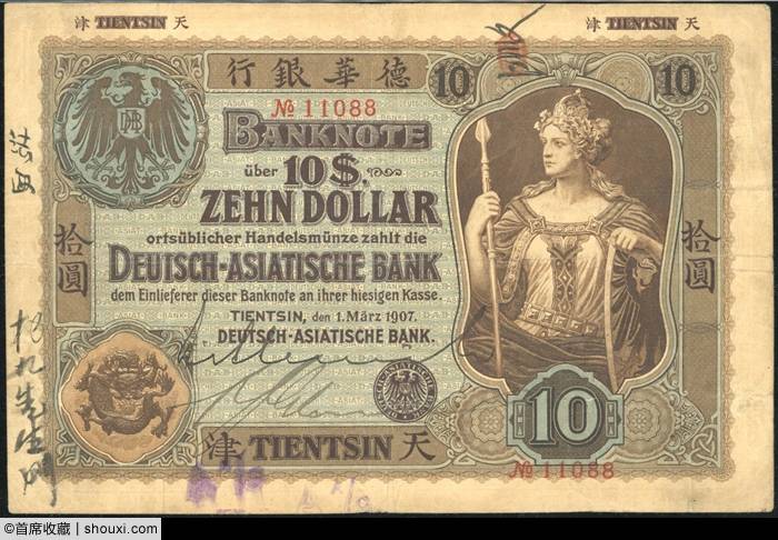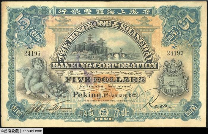 1907年德华银行拾圆天津地名,PMG-25,冠军分,蓝底棕字,少许墨迹,轻微折痕,状态自然,13万港币落槌,含佣约合人民币14.04万元成交;1922年香港上海汇丰银行伍圆,北京地名,PMG-30,亚军分,有渍、墨印及壁裂纹,图案立体感强,14万港币落槌,含佣约合人民币15.12万元成交;1910年美商北京花旗银行伍圆,北京地名,流通钞较少见,纸张厚实,2600港币落槌;1905年美商上海花旗银行伍圆,上海地名,PMG-58,唯一冠军分,纸张厚实,色彩饱满,2万港币落槌;1924年上海有利银行壹员,PMG-55,早期稀有版别,票角完好,印章鲜明,2.8万港币落槌。