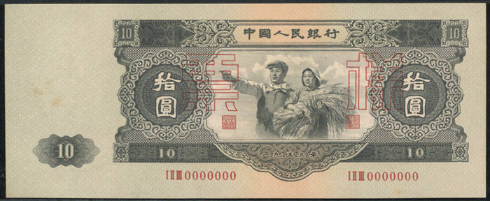 二版币叁圆票样,PMG-64,纹理清晰,色彩鲜艳,4.2万港币落槌;二版币伍圆票样,PMG-64,纸张洁净,图纹明晰,1.5万港币落槌;二版币拾圆大黑拾票样,PMG-63,名誉品,有微渍,边角齐整,纸质柔韧,油墨浓郁,12万港币落槌,含佣约合人民币12.96万元成交;二版币壹圆票样,PMG-63,票体洁净,色调自然,6000港币落槌。