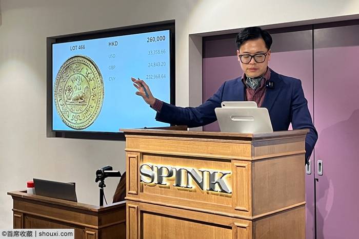 西藏桑康果木一两,PCGS-AU53,图案清晰,包浆自然,5万港币落槌;西藏狮图金币20两1918,PCGS-MS62,光泽柔和,字口规整,7.5万港币落槌;西藏狮图金币20两1919,PCGS-MS62,底光通透,图文清晰,8万港币落槌,含佣约合人民币8.64万元成交;西藏狮图金币20两1919,PCGS-MS61,痕迹浅淡,包浆自然,5.5万港币落槌;西藏狮图金币20两1920,PCGS-MS65,金光熠熠,质感细腻,图文饱满,轻微偏铸,26万港币落槌,含佣约合人民币28.08万元成交。