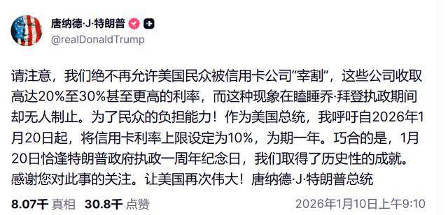 近日,美国总统特朗普呼吁将信用卡利率设定为期一年的上限10%,自1月20日起生效,但未说明具体细节。