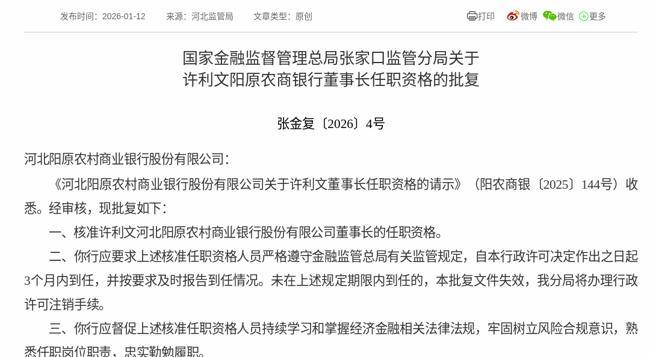 2026年1月12日,根据国家金融监督管理总局消息,《河北阳原农村商业银行股份有限公司关于许利文董事长任职资格的请示》获得通过,批复许利文河北阳原农村商业银行股份有限公司董事长的任职资格。