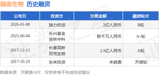 证券之星消息,根据天眼查APP于1月8日公布的信息整理,上海瑞宙生物科技有限公司B轮融资,融资额2亿人民币,参与投资的机构包括瑞力投资。