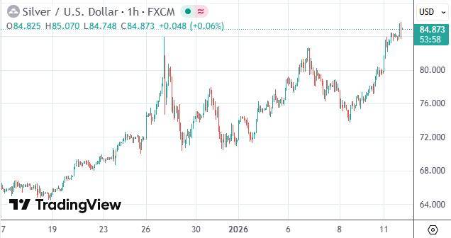 截至收盘,现货白银价格升超6%报每盎司85.15美元,日内一度涨逾7%至85.74美元;现货黄金则一度涨2.4%至每盎司4620.34美元,均刷新了2025年12月下旬录得的历史纪录。