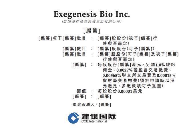 瑞财经 刘治颖 1月14日,Exegenesis Bio Inc.(以下简称:嘉因生物)向港交所主板递交上市申请,建银国际为其独家保荐人。