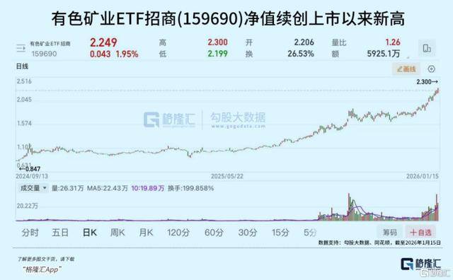 2026年以来,资金进一步加速流入有色板块,其中有色矿业ETF招商(159690.SZ)净值续创上市以来新高,近10日获资金净流入超1.1亿元,净流率翻倍。