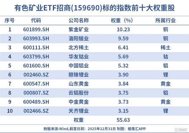 作为聚焦上游资源领域的投资工具,有色矿业ETF招商(159690.SZ)覆盖金银铜锂稀土等多种战略性资源,聚焦资源品上游,黄金、铜、铝等关键金属权重占比近六成,通过集中投资上游资源龙头,囊括了紫金矿业、北方稀土、洛阳钼业、华友钴业、山东黄金、赣锋锂业等巨头,因而能在有色金属价格上涨时净值涨幅往往数倍于商品本身,展现出显著的价格弹性。