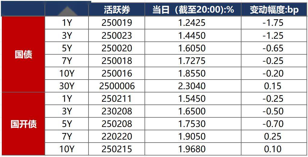 1月15日,早盘股市偏弱,带动债市继续修复,午后央行宣布结构性降息25bp,债市先涨后跌。全天看,债市整体偏强震荡,截至北京时间20:00,10年期国债活跃券250016收益率下行0.20bp至1.8550%,10年期国开债活跃券250215收益率上行0.10bp至1.9680%