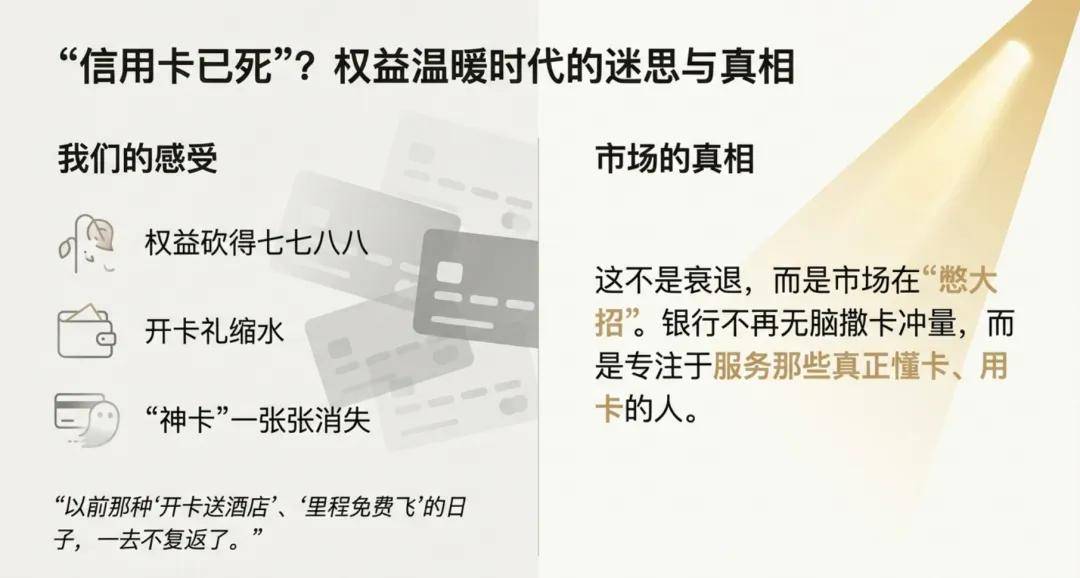 别急着下结论。在帅帅看来,这恰恰是市场在“憋大招”。现在的冷淡,其实是下一个时代的开始。因为我们都已经发现:银行不再无脑撒卡冲量,而是会静下心来,专注于服务那些真正愿意用卡、懂得用卡的人。