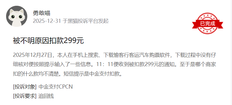 在上述案例之外,在投诉平台中,消费者反馈的扣款多发生在“误触广告弹窗”“火车票误操作”“联合会员订阅”等情形。其中一位消费者表示,其于2025年12月27日在手机上搜索、下载愉客行客运汽车购票软件,下载过程中没有仔细核对便按照提示输入了一些信息,同日11:11便收到被扣款299元的通知。这类操纵下导致的“乱扣费”引发公众对支付安全的担忧。