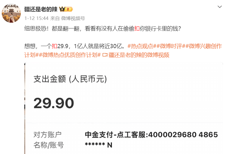 以微博中一位消费者的投诉为例。在他的案例中,其银行账户连续多月被通过“中金支付”的渠道被扣走29.9元,扣款方是“点工客服”。对于支付过程,该用户称未有验证码以及支付密码的提示。