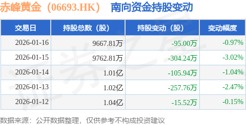 赤峰黄金(06693.HK):1月16日南向资金减持95万股