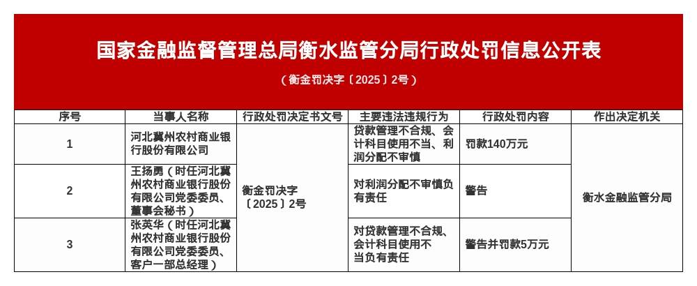 针对上述违法违规行为,国家金融监督管理总局衡水监管分局对其罚款140万元;对王扬勇(时任河北翼州农村商业银行股份有限公司党委委员、董事会秘书)警告;对张英华(时任河北冀州农村商业银行股份有限公司党委委员、客户一部总经理)警告并处罚款5万元。
