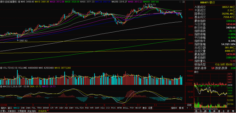 也正因受多家银行股跌破年线大关拖累,银行指数距离250天线也就是年线大关,只有2.5%不到的距离了。