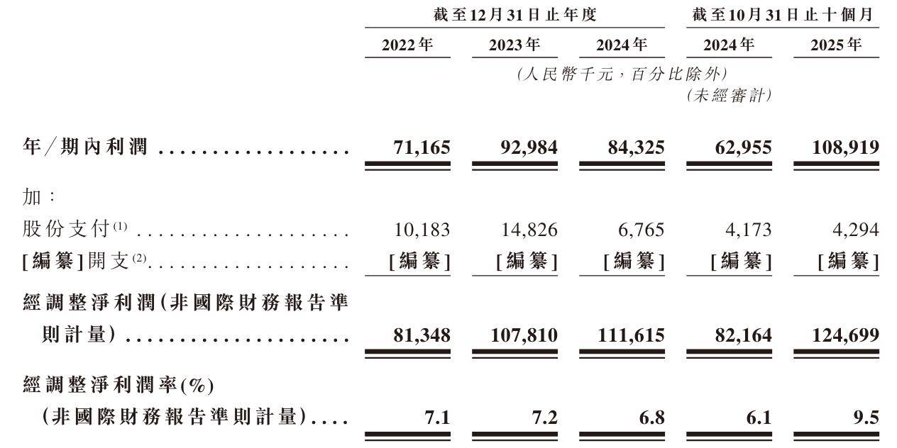 富友支付2022年、2023年、2024年经调整利润分别为8135万元、1.08亿元、1.16亿元;经调整净利率分别为7.1%、7.2%、7.1%;2025年前10个月经调整净利为1.25亿元,经调整净利率为9.5%。