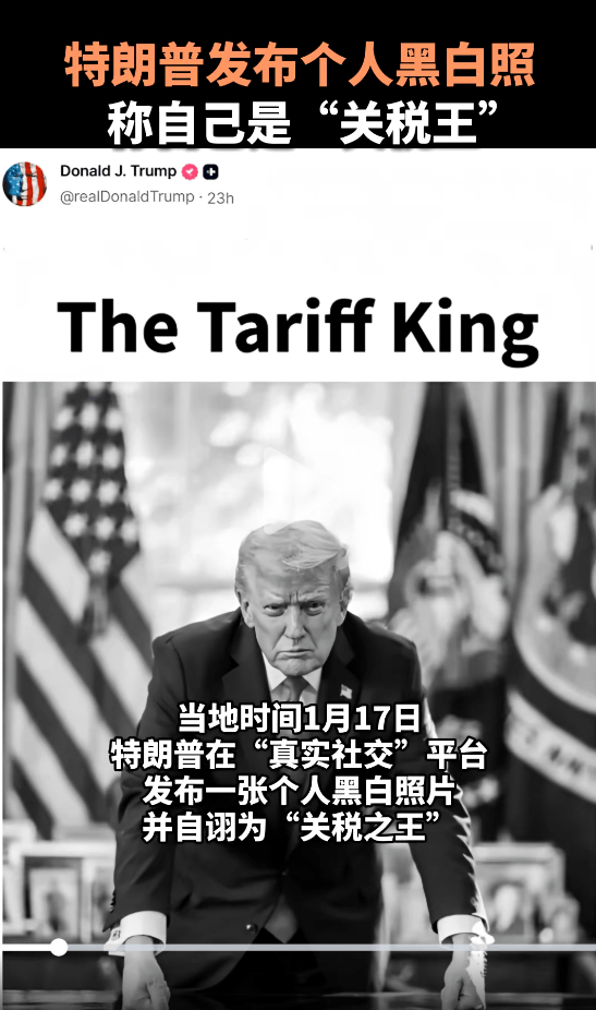 当地时间1月17日,美国总统特朗普在“真实社交”平台发布一张个人黑白照片,并自诩为“关税之王”。
