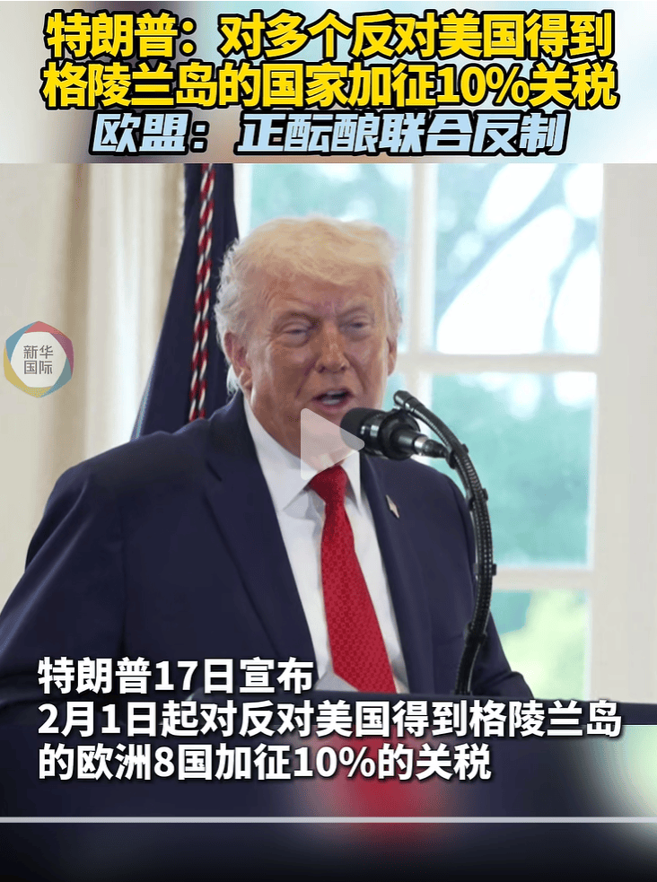 特朗普17日在社交媒体上发文,宣布美国将从2月1日起对丹麦、挪威、瑞典、法国、德国、英国、荷兰和芬兰的输美商品加征10%关税;加征关税的税率将从6月1日起提高至25%,直到相关方就美国“全面、彻底购买格陵兰岛”达成协议。