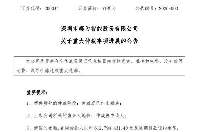 1月18日晚间,深圳市赛为智能股份有限公司(以下简称“ST赛为”)披露重大仲裁事项进展公告,公司作为仲裁被申请人,已收到深圳国际仲裁院作出的终局裁决。根据裁决结果,公司需向申请人支付合同价款、违约金及相关费用,该事项与另一关联案件共同对公司2025年度净利润产生约-7.18亿元的影响,公司2025年末净资产可能为负,存在被实施退市风险警示的风险。