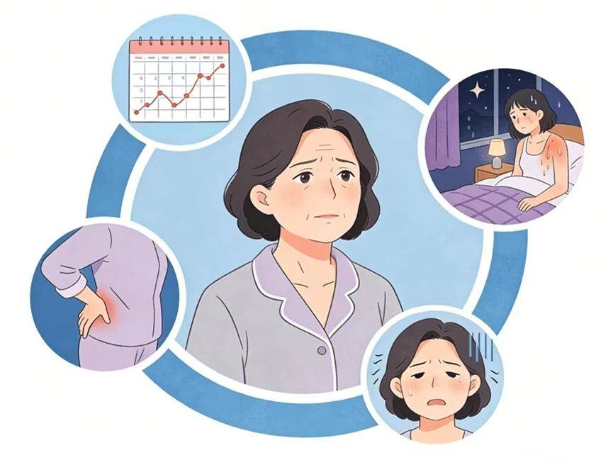 围绝经期(通常45–55岁)是卵巢功能逐渐衰退的过程,雌激素水平波动性下降,带来一系列连锁反应: