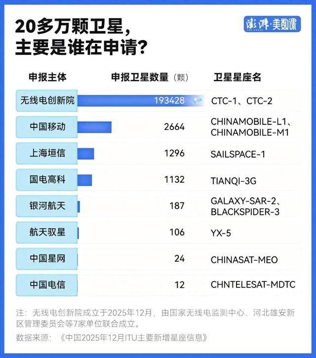 近期,国际电信联盟(ITU)一组数据显示:我国已向其提交新增20.3万颗卫星的频轨资源申请,涵盖14个卫星星座,规模创下历史新高。这一申报并非单一主体行为,而是呈现出多元化布局特征,其中无线电创新院成为绝对主力,其申请的CTC-1和CTC-2两大星座合计达193428颗卫星,占总申报量的95%以上。此外,中国移动、垣信卫星、国电高科等企业及传统通信运营商也纷纷入局,整体形成了“国家队引领、商业化协同”的格局。