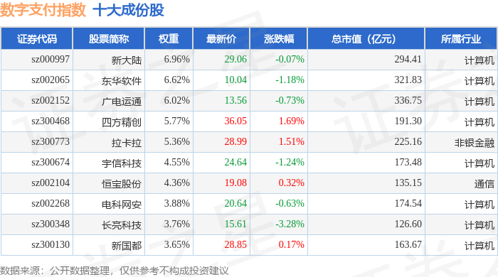 数字支付(980113)指数十大成份股详情如下: