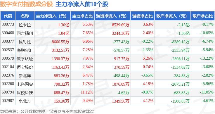 资金流向方面,数字支付(980113)指数成份股当日主力资金净流出合计15.46亿元,游资资金净流入合计9.65亿元,散户资金净流入合计5.75亿元。成份股资金流向详情见下表: