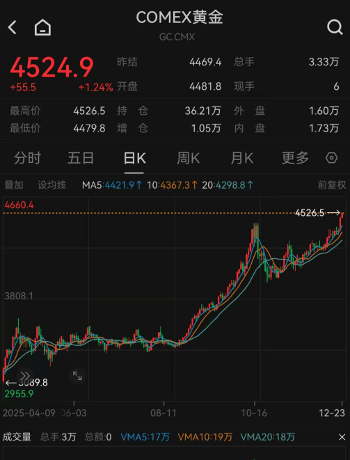 继前一日大幅上涨、创下历史新高后,12月23日,COMEX黄金又相继突破4500美元/盎司、4510美元/盎司、4520美元/盎司关口,截至发稿,报4524.9美元/盎司,年内涨幅超62%;伦敦金现也突破4490美元/盎司关口,截至发稿,报4490.08美元/盎司,年内涨幅超71%。