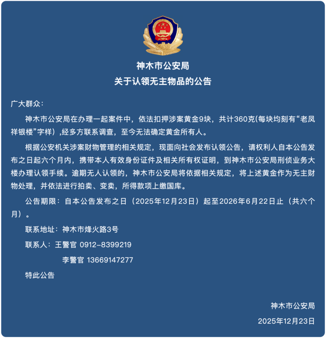 根据公安机关涉案财物管理的相关规定,现面向社会发布认领公告,请权利人自公告发布之日起六个月内,携带本人有效身份证件及相关所有权证明,到神木市公安局刑侦业务大楼办理认领手续。逾期无人认领的,神木市公安局将依据相关规定,将上述黄金作为无主财物处理,并依法进行拍卖、变卖,所得款项上缴国库。