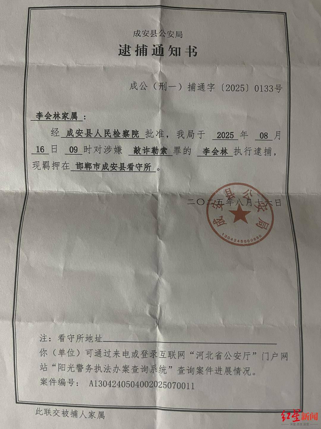 相关通知书显示,李会林2025年8月1日因涉嫌敲诈勒索罪被成安县公安局刑事拘留,李春梅和李小月8月2日因涉嫌敲诈勒索罪被成安县公安局刑事拘留。8月15日,因成安县人民检察院不批准逮捕,李春梅和李小月被取保候审并释放。8月16日,李会林被执行逮捕。
