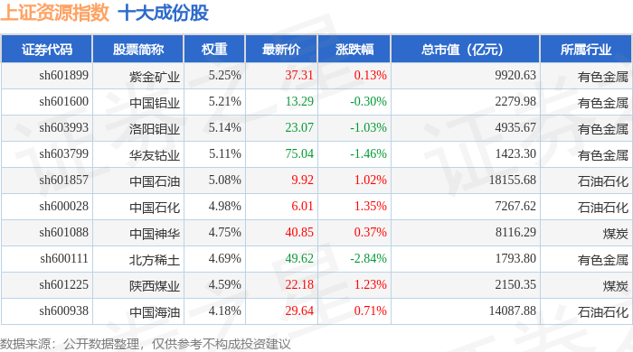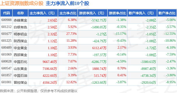 资金流向方面,上证资源(000068)指数成份股当日主力资金净流出合计24.65亿元,游资资金净流入合计1.73亿元,散户资金净流入合计22.92亿元。成份股资金流向详情见下表: